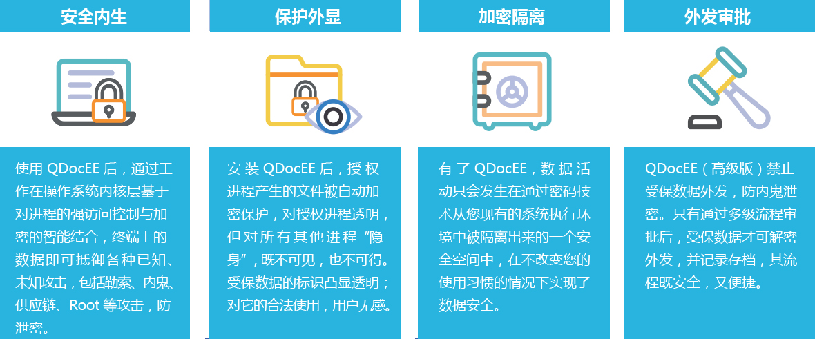 部署了 QDocEE 后,终端上的数据就具备了自我保护能力,可以抵御各种已知、未知攻击,包括勒索、内鬼、供应链、Root 等攻击,防泄密;